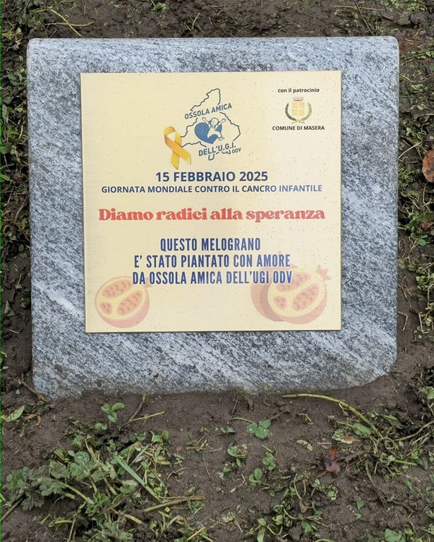 Si è svolta ieri a Masera la piantumazione di un albero di melograno, simbolo di speranza, in occasione della Giornata Mondiale contro il Cancro Infantile. L’iniziativa, promossa per il terzo anno dall’associazione Ossola Amica dell’Ugi, ha visto la partecipazione dell’amministrazione comunale, con il sindaco Norma Angela Bianchi, degli alpini di Masera-Trontano, di Marco Santin del gruppo Aib di Masera e del parroco Don Luigi, che ha impartito la benedizione.