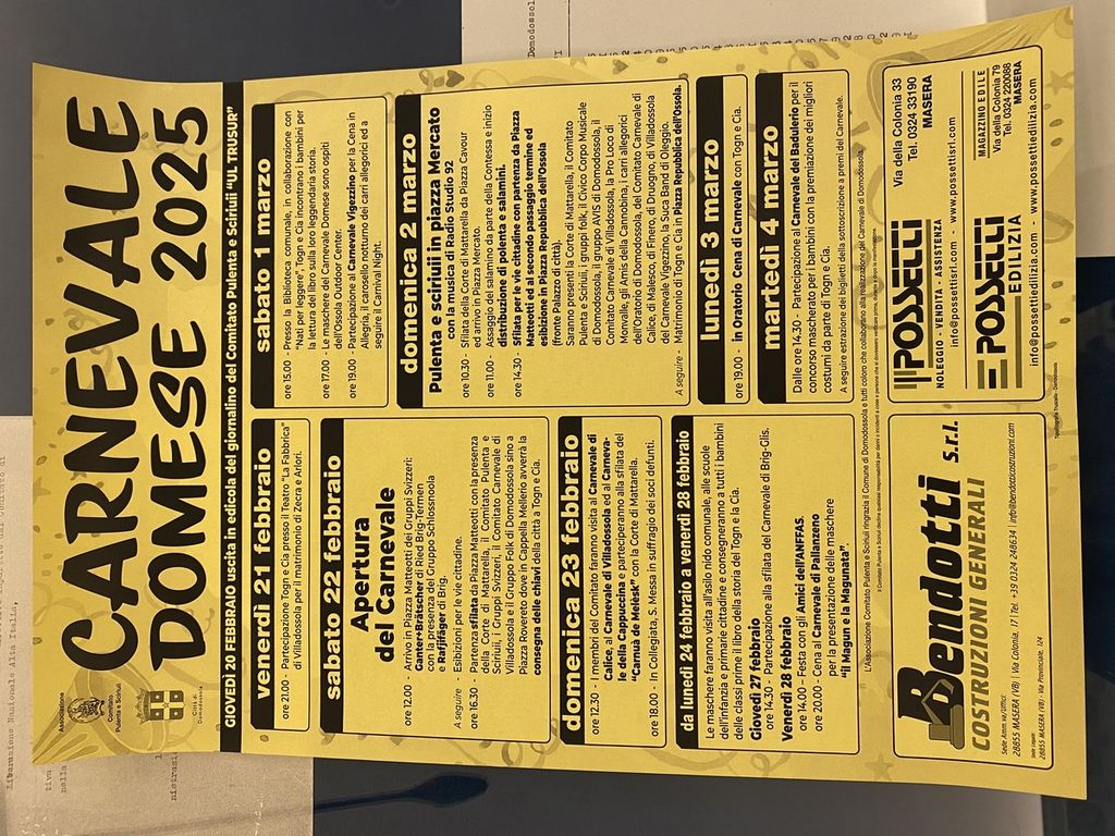 Sabato 1° marzo alle 15.00 l’appuntamento con Nati per leggere in biblioteca, in cui il Togn e la Cia leggeranno ai bambini il libro sulla loro storia. Alle 17.00 la visita all’Ossola Outdoor Center di Crevoladossola e alle 19.00 la partecipazione al Carnevale Vigezzino.