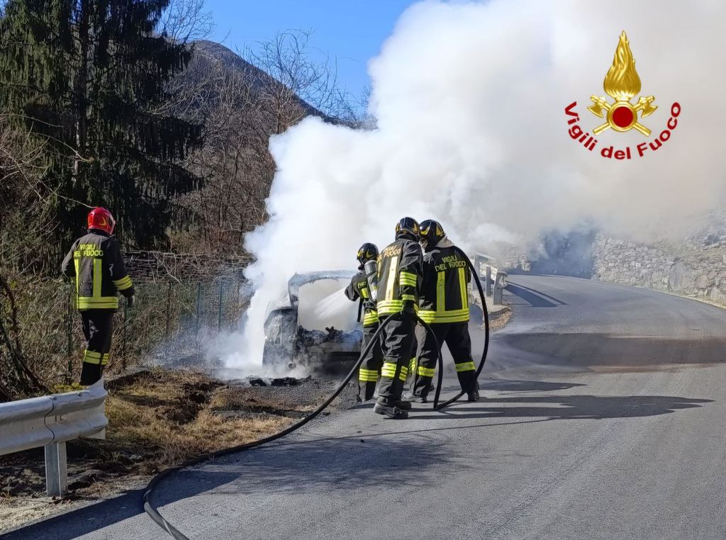 L'incendio è avvenuto sulla statale poco prima del bivio per il paese di Orasso nel comune di Valle Cannobina e il conducente dell'auto, appena accortosi del fumo fuoriuscire è riuscito ad accostare il veicolo a bordo strada e a chiamare i soccorsi. Nessuna persona ferita. Sul posto anche i carabinieri di Cannobio.
