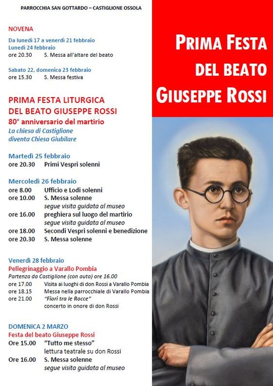Prima festa liturgica del Beato don Giuseppe Rossi, il parroco di Castiglione, martire della fede e della carità, ucciso dai fascisti nel 1945. Oggi, 26 febbraio è una data molto particolare perché è l'80 esimo anniversario della morte di don Giuseppe Rossi che l'anno scorso, il 26 maggio, è stato beatificato. In occasione di questa ricorrenza il 26 febbraio la chiesa di San Gottardo di Castiglione Ossola diventa chiesa giubilare per un giorno, grazie ad una concessione straordinaria ottenuta dalla parrocchia da parte del Vaticano e della diocesi di Novara.