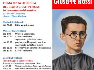 Prima festa liturgica del Beato don Giuseppe Rossi, il parroco di Castiglione, martire della fede e della carità, ucciso dai fascisti nel 1945. Oggi, 26 febbraio è una data molto particolare perché è l'80 esimo anniversario della morte di don Giuseppe Rossi che l'anno scorso, il 26 maggio, è stato beatificato. In occasione di questa ricorrenza il 26 febbraio la chiesa di San Gottardo di Castiglione Ossola diventa chiesa giubilare per un giorno, grazie ad una concessione straordinaria ottenuta dalla parrocchia da parte del Vaticano e della diocesi di Novara.