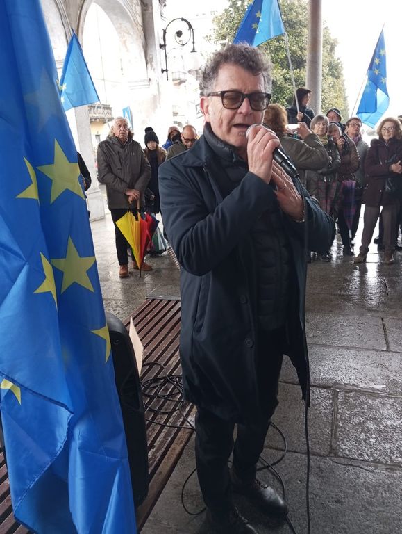 Per Stefano Costa, presidente provinciale di Stati Uniti per l’Europa, “dobbiamo partire da ciò che ci unisce, se la difesa comune può unirci costruiamola, difesa comune non vuol dire volere la guerra, ci avevano già pensato i padri dell’Europa con la Ced (Comunità europea difesa, ndr) furono singoli stati sovrani a non volerla”. “Arturo Palmeri (XXI Marzo) ha sottolineato: “Provo due motivi di rabbia. Il primo perché l’Europa sta tornando indietro, il secondo perché ci sono cittadini che non condividono questa piazza (riferito all’appuntamento del 5 aprile dei 5Stelle, ndr) .Dimentichiamo che l’Europa, nel mondo, è l’unica realtà che punta sulla democrazia.”