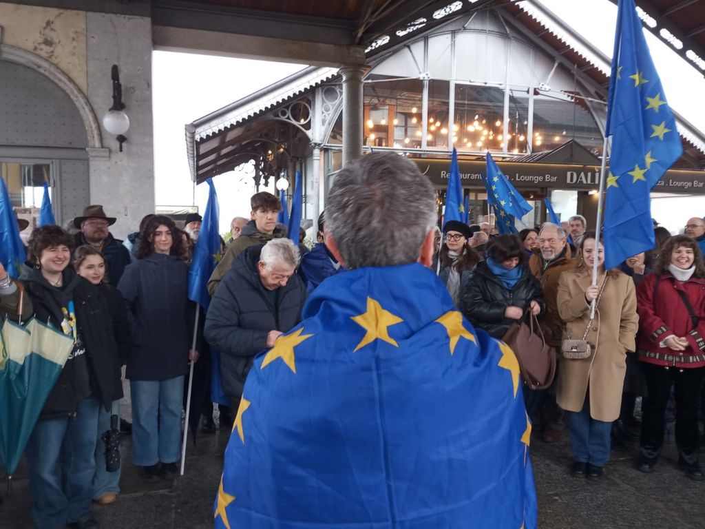 Uno sventolio di bandiere blu stellate, vessillo dell’Europa, impugnate da una piccola folla sotto la tettoia dell’Imbarcadero vecchio di Intra a supporto della piazza romana organizzata da Michele Serra. “Viviamo una fase storica delicata e complessa– ha esordito Giacomo Molinari, segretario del Pd di Verbania -, siamo qui per un futuro che sia d’Europa, siamo qui per rinnovare la promessa fatta tanti anni fa da Altiero Spinelli e dagli altri firmatari del manifesto di Ventotene. Questa bandiera deve rappresentarci tutti”.