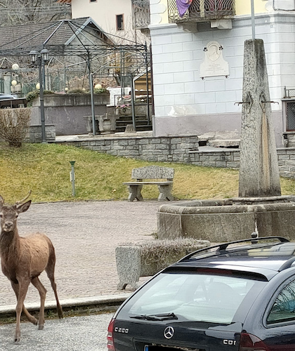 Un lettore ha fotografato un cervo mentre si aggirava nelle vie e nelle piazze di Bannio Anzino domenica mattina. Non è la prima volta che l'animale viene visto nel centro del paese della Valle Anzasca.