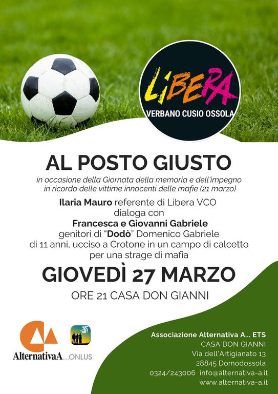 Giovedì 27 marzo, Casa don Gianni ospiterà un incontro toccante e significativo con Francesca e Giovanni, i genitori di Domenico “Dodò” Gabriele, vittima innocente di mafia. A dialogare con loro sarà Ilaria Mauro, referente di Libera Vco.