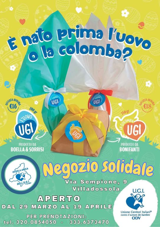 Queste dolcezze, oltre a rallegrare le tavole delle feste, contribuiranno a sostenere le iniziative di Ossola Amica dell'Ugi che si occupa di supportare le famiglie dei bimbi malati di tumore. Uova e colombe si possono acquistare presso il negozio solidale di via Sempione a Villadossola dove è possibile trovare tante altre squisitezze ed idee regalo.
