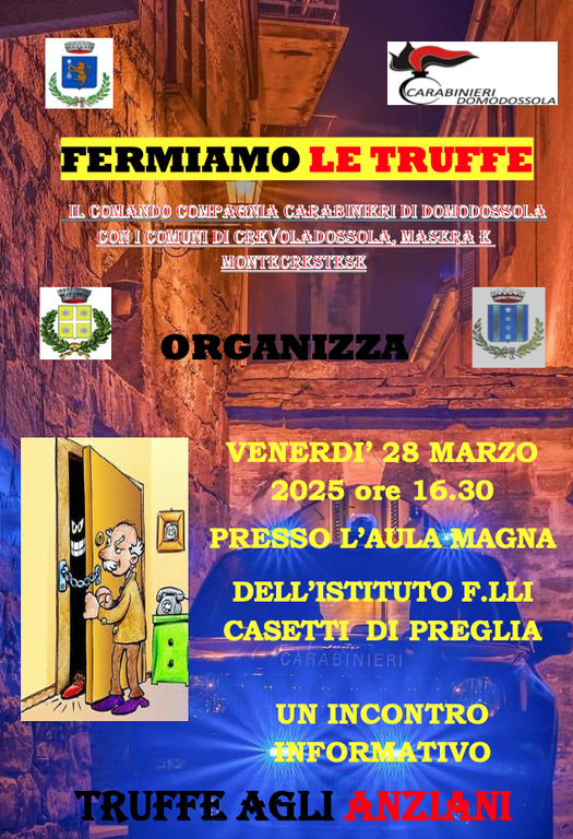 Un incontro informativo si terrà domani, venerdì 28 marzo, alle ore 16:30 nell'Aula Magna dell'Istituto "F.lli Casetti" di Crevoladossola, con l’obiettivo di sensibilizzare la cittadinanza sulle numerose truffe che si stanno verificando nel territorio, in particolare quelle che coinvolgono le persone anziane.
