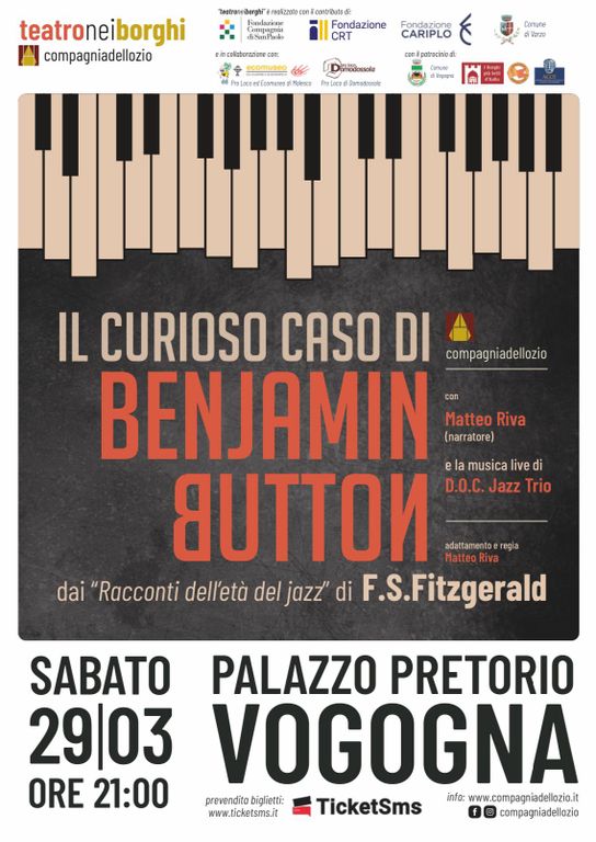 Sabato 29 marzo 2025, alle ore 21, il Palazzo Pretorio di Vogogna ospiterà una serata speciale con «Il curioso caso di Benjamin Button», tratto dai Racconti dell’età del Jazz di F. S. Fitzgerald. L’evento, organizzato dalla Compagniadellozio in collaborazione con l’Associazione Culturale Ossola Inferiore, promette di essere un affascinante viaggio nel tempo, tra la magia della narrazione e le note jazz che hanno definito un’intera epoca.