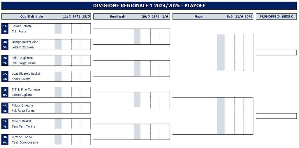 L'ultima giornata del girone B di Dr1 ha definito la classifica e i conseguenti accoppiamenti ai play-off. La Paracchini Expo Foma debutterà in casa nella post season giovedi al PalaBagnella contro Reba Torino, quinta classificata: fattore campo a favore dei ragazzi di Verri. La Findomo Pediacooph24, sesta, troverà Victoria Torino, terza al termine della stagione regolare. Le due teste di serie dei tabelloni sono Galliate da una parte e Pino Torinese dall'altra.
