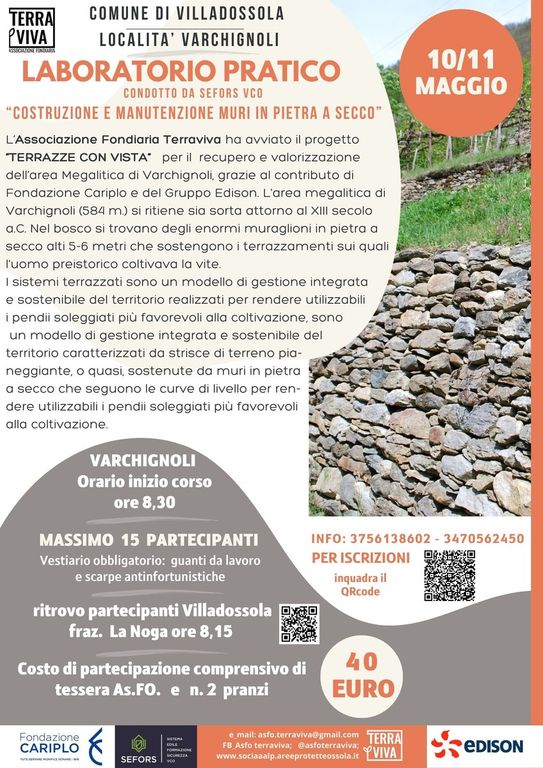 Un'occasione concreta per imparare un sapere antico, oggi più che mai attuale nella gestione sostenibile del territorio. Il 10 e 11 maggio a Varchignoli, frazione del Comune di Villadossola, si terranno due giornate di formazione tecnico-pratica dedicate alla costruzione e manutenzione dei muri in pietra a secco. L’iniziativa si inserisce nel progetto “Terrazze con vista”, promosso dall’Associazione Fondiaria Terraviva in collaborazione con Sefors Vco e con il sostegno di Fondazione Cariplo e Gruppo Edison nell’ambito del programma Join Nature.