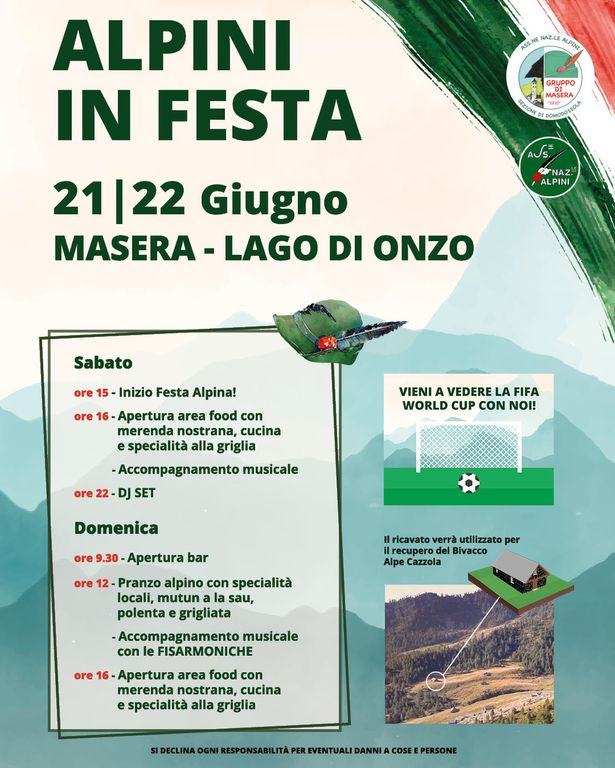 Sabato il programma proseguirà già dalle 9.30 con l’apertura del bar. Alle 12 è previsto il pranzo alpino, che proporrà piatti tipici come il mutun a la sau, la polenta e le grigliate, accompagnati dalla musica delle fisarmoniche. Nel pomeriggio, dalle 16, nuova apertura dell’area food. Durante entrambe le giornate sarà possibile assistere alla proiezione delle partite della Fifa World Cup, creando così un’occasione di incontro anche per gli appassionati di calcio. Il ricavato della manifestazione sarà destinato al recupero del Bivacco Alpe Cazzola, a sostegno del patrimonio montano del territorio.