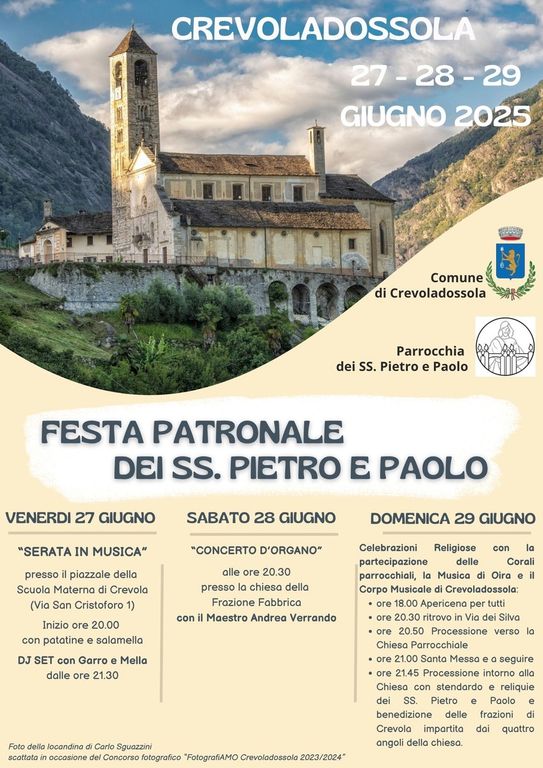 La giornata clou sarà quella di domenica 29 giugno, dedicata alle celebrazioni religiose e al coinvolgimento delle diverse realtà del paese. Alle 18.00 aprirà un momento conviviale con apericena per tutti, cui seguirà alle 20.30 il ritrovo in via dei Silva per la processione verso la Chiesa Parrocchiale. Dopo la Santa Messa delle 21.00, la serata si concluderà con la tradizionale processione attorno alla chiesa, accompagnata dal Corpo Musicale di Crevoladossola, con lo stendardo e le reliquie dei Santi Patroni. Durante il rito si svolgerà anche la benedizione delle frazioni di Crevola, impartita dai quattro angoli della chiesa.