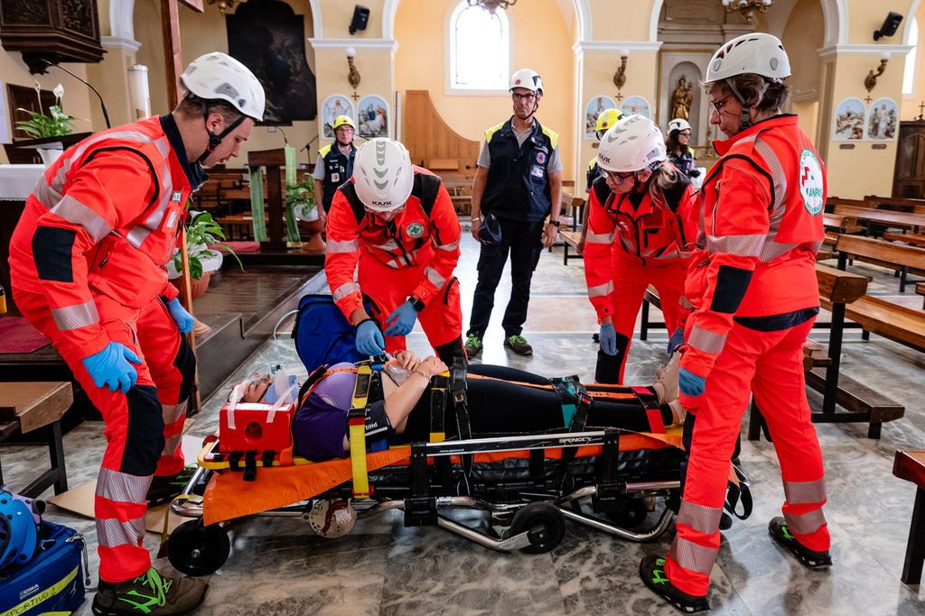 Domenica mattina, durante la funzione religiosa nella Parrocchia di None, è andata in scena una spettacolare simulazione di maxiemergenza sismica, con interventi simultanei all’interno e all’esterno della chiesa, la messa in opera di un Pam (Posto Medico Avanzato) e l’attivazione di operatori specializzati nella ricerca dispersi. Un’esercitazione ad alto impatto, seguita anche dal pubblico tramite maxischermo.