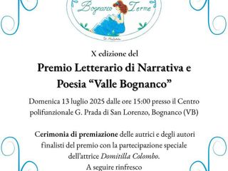 Domenica 13 luglio alle ore 15:00, sempre al centro “Guido Prada”, si terrà invece la cerimonia di premiazione della decima edizione del Premio di Narrativa e Poesia “Valle Bognanco”, che anche quest’anno ha richiamato autori da tutta Italia. Oltre alla proclamazione dei primi tre classificati per le sezioni narrativa e poesia, sono previsti due premi speciali della giuria e menzioni d’onore. Il Premio Speciale alla Carriera verrà assegnato al giornalista e scrittore Giancarlo Castellano.