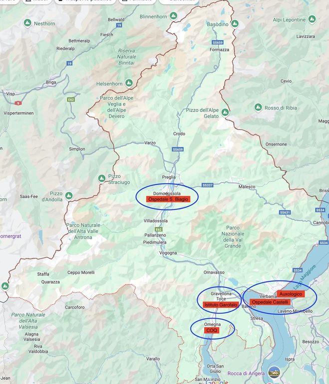 “Questa (nell’immagine allegata) è l'ubicazione dei siti che erogano servizi sanitari pubblici sul nostro territorio – le parole di Bonacci -. Vi è un evidente squilibrio tra il Verbano-Cusio, dove sono presenti ben quattro strutture pubbliche o private convenzionate che erogano servizi con il Ssn, e l'Ossola che ne ha soltanto uno. L'ipotesi di chiudere il San Biagio e costruire un nuovo ospedale provinciale sul territorio di Verbania (come chiede il sindaco Albertella) o in luogo cosiddetto "baricentrico" che secondo l'ordine dei medici e molti esponenti politici graviterebbe attorno a Gravellona sarebbe la fine dei servizi sanitari pubblici sul territorio ossolano”.