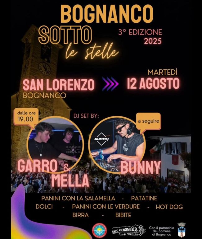 Si svolgerà domani, martedì 12 agosto, la terza edizione di Bognanco sotto le stelle, in programma a San Lorenzo. L’evento, organizzato dallo sci club di Bognanco con il patrocinio del Comune, prenderà il via alle 19 con il dj set di Garro & Mella, a cui seguirà l’esibizione di dj Bunny. Per tutta la durata della serata sarà attiva un’area ristoro a disposizione dei partecipanti.