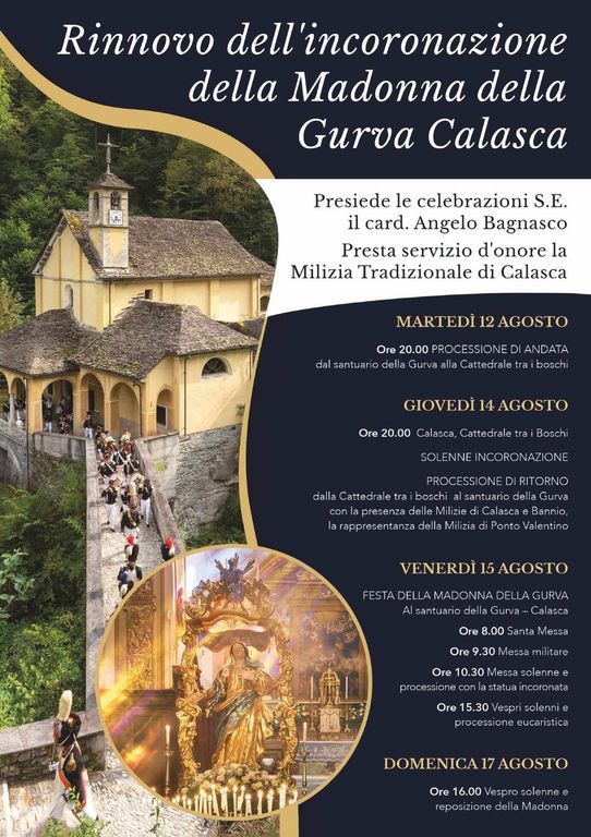 La Valle Anzasca si prepara a vivere uno degli appuntamenti più sentiti dell’estate: il rinnovo dell’incoronazione della Madonna della Gurva, tra le celebrazioni religiose più care alla comunità di Calasca. Un evento solenne e profondamente radicato nella tradizione, che dal 12 al 17 agosto vedrà coinvolti fedeli, autorità civili e religiose, oltre alla Milizia Tradizionale di Calasca, custode e simbolo della devozione popolare.
