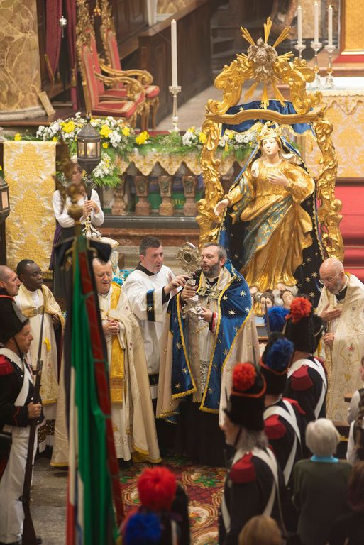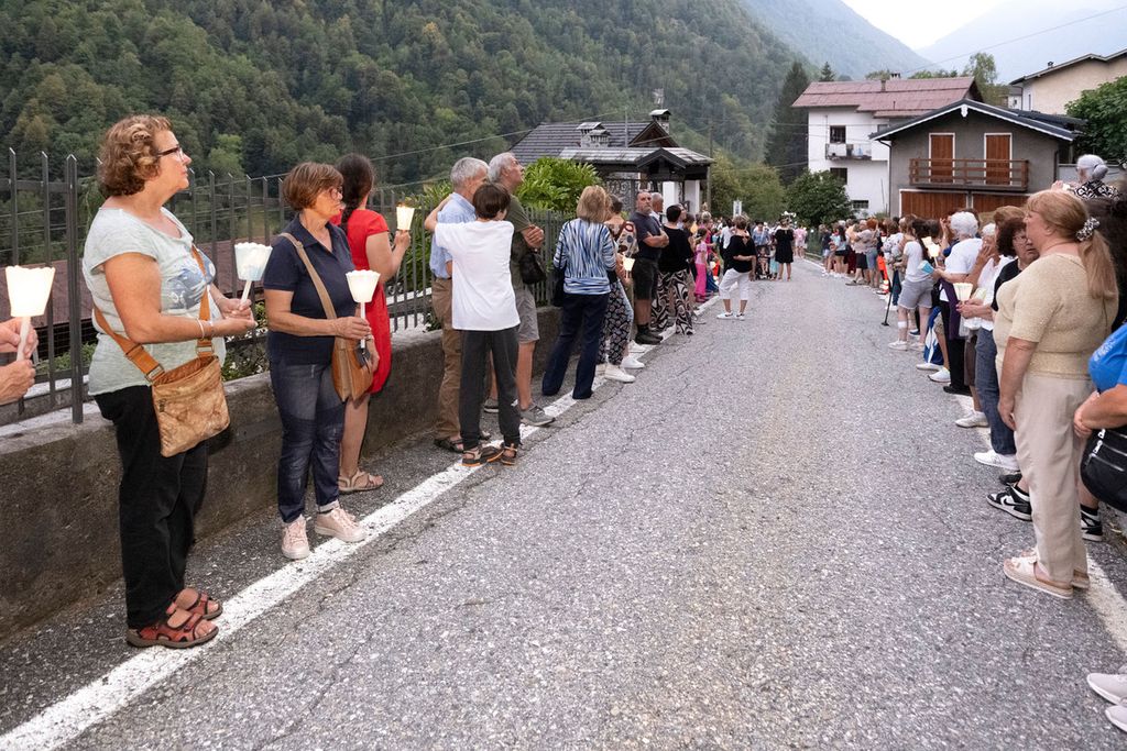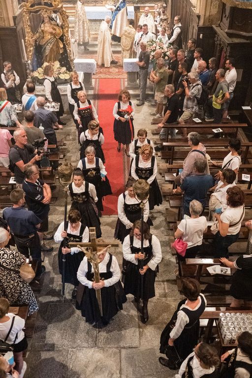 Nel crepuscolo della sera le fiaccole dei fedeli hanno risalito la china, attraversando le frazioni di Molini, Dujamen, Vigino, Boretta, salutate dalla Banda di Baceno, che ha prestato il suo servizio nella processione. Giunta in piazza, la Madonna si è fermata al centro, circondata dalla Milizia schierata sull’attenti, che ha poi salutato la Madonna con una scarica a salve. Nella chiesa la statua verrà nuovamente incoronata dal cardinale Angelo Bagnasco nella serata del 14 agosto, per essere poi nuovamente accompagnata in processione fino al santuario. Alla celebrazione saranno presenti anche le Milizie di Calasca e Bannio, una rappresentanza della Milizia Napoleonica di Ponto Valentino, in Svizzera, numerose confraternite e gruppi in costume da tutta l’Ossola e oltre.