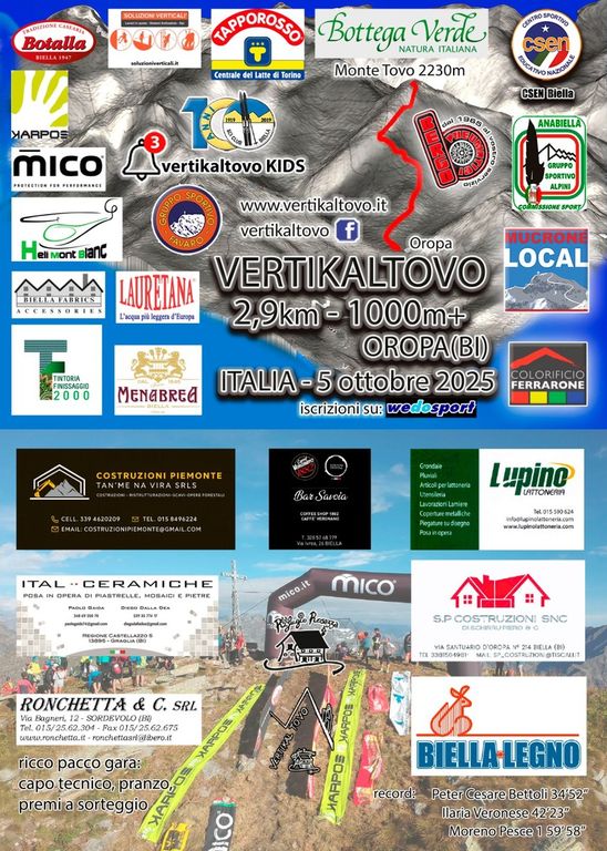 Domenica 5 ottobre torna il Vertikal Tovo, appuntamento ormai tradizionale organizzato come sempre dal GS Favaro, affiliato CSEN. L’edizione 2025 si preannuncia particolarmente speciale: oltre alla classica sfida verticale di 2,9 km con 1000 metri di dislivello positivo, con partenza da Oropa, quest’anno la gara sarà legata da un gemellaggio con altre due competizioni di grande richiamo, il Morrisolo Vertikal in programma il 19 ottobre a Verbania (1070m D+ e 3,9km) e il Vertical Tube di Villeneuve, in Valle d’Aosta (650m D+ 1,9Km), previsto per il 2 novembre 2025 e caratterizzato da un tracciato simile per impegno tecnico.