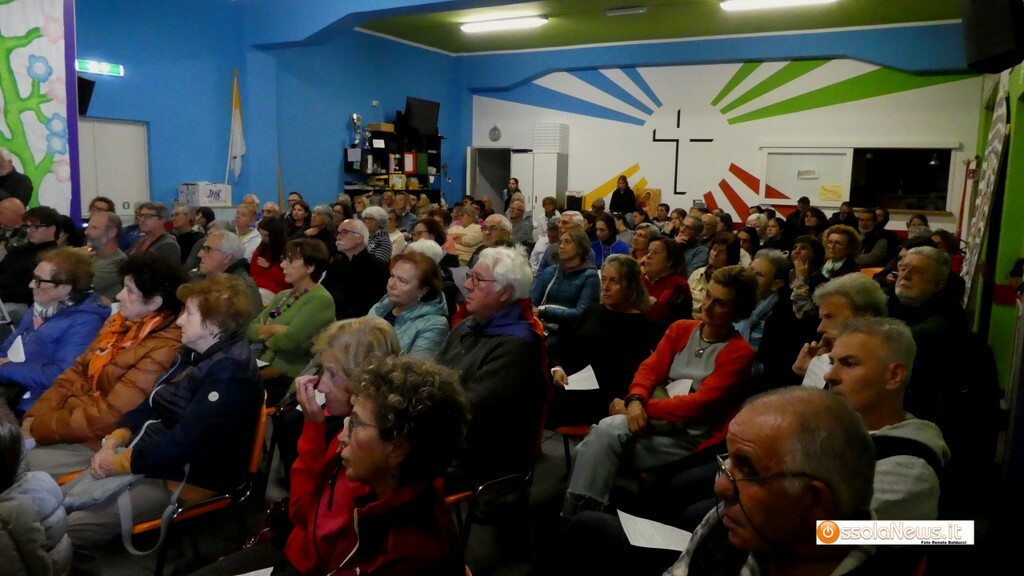 Don Nandino Capovilla, parroco di Marghera e da oltre 20 anni impegnato per la Palestina con la campagna ‘Ponti e non muri’’ di Pax Christi, parla per un’ora e mezza all’oratorio di Villadossola. All’incontro, organizzato dalle parrocchie di Villadossola e della Valle Antrona per riflettere su quanto succede in Palestina, almeno 110-120 persone. In sala anche il parroco di Villa, don Massimo Bottarel, e al suo collaboratore don Renato Sacco.
