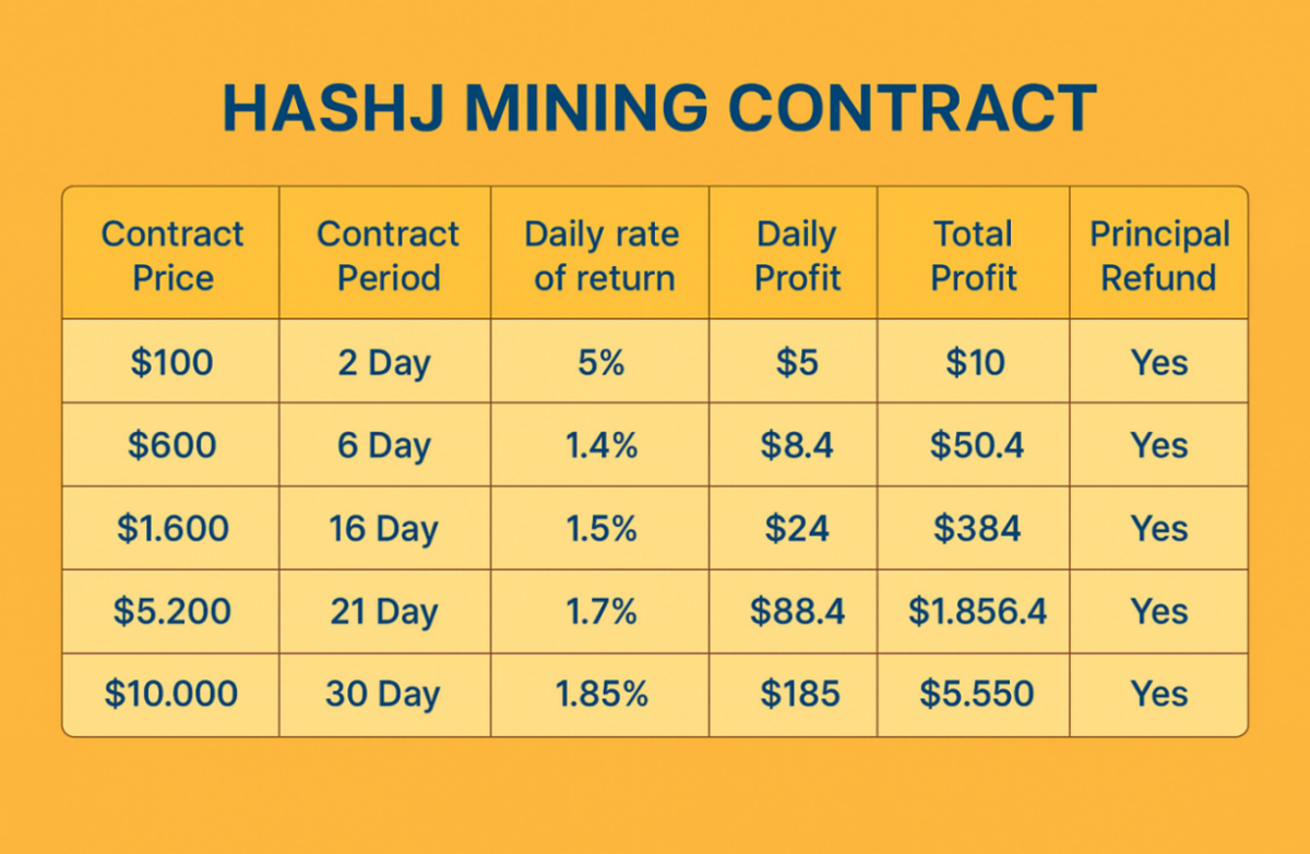 A differenza di piattaforme rischiose che promettono guadagni irrealistici, Hashj offre contratti di mining strutturati con tassi di profitto chiari. Questo permette agli utenti di calcolare facilmente i guadagni e gestire i propri investimenti con sicurezza.
