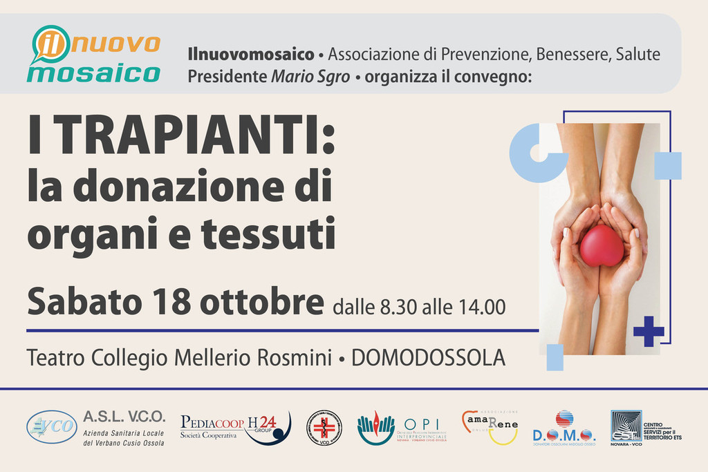 Appuntamento sabato 18 ottobre dalle 8.30 alle 14.00 presso il Teatro Collegio Rosmini a Domodossola con il convegno promosso da ilnuovomosaico in collaborazione con ASL VCO "I trapianti. La donazione di organi e tessuti". L'evento è aperto a tutti e accreditato per 3 Ecm alle professioni sanitarie.