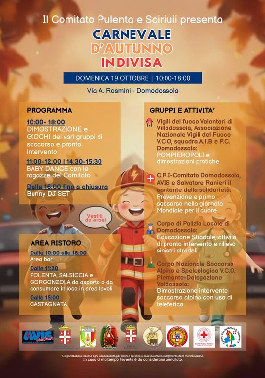 Domenica 19 ottobre, dalle 10 alle 18, via Antonio Rosmini a Domodossola si animerà con il “Carnevale d’Autunno in Divisa”, una giornata di festa, divertimento e solidarietà organizzata dal Comitato Pulenta e Sciriuii in collaborazione con numerose realtà del territorio. Un evento pensato per le famiglie, che permetterà a grandi e piccoli di conoscere da vicino il mondo del soccorso, della prevenzione e della sicurezza.