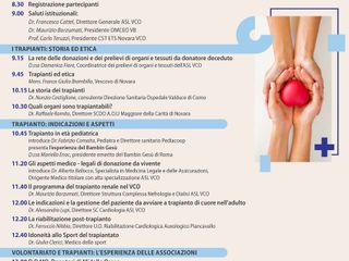 Il convegno aprirà con i saluti del direttore generale Asl VCO Francesco Cattel, del Presidente Omnce VB dott. Maurizio Borzumati (che relazionerà poi sul trapianto di rene) e del presidente Cst Carlo Teruzzi e vedrà la partecipazione di illustri medici del nostro territorio che, ognuno secondo il proprio campo di intervento, relazioneranno sugli aspetti legati ai trapianti di organi, ma non solo. La rete della donazione con la d.ssa Domenica Fiore, Coordinatrice dei prelievi di organi e tessuti dell’Asl VCO; la sfera etica con il Vescovo Mons. Giulio Brambilla, i trapianti in età pediatrica, introdotti da dott. Fabrizio Comaita e a cura dellad.ssa Mariella Enoc - presidente emerito del Bambin Gesù di Roma - che porterà la sua esperienza; il trapianto di cuore con il Direttore della cardiologia dell’ASL VCO dott. Alessandro Lupi. E ancora le testimonianze delle associazioni che sul territorio si occupano di donazione di organi e sensibilizzazione al tema: Donatori Ossolani Midollo Osseo e AmaRene. Un taglio, quello del convegno, certamente rivolto alle professioni del settore (è accreditato per 3 Ecm), ma capace di trattare dei temi e di utilizzare un linguaggio alla portata di tutti.
