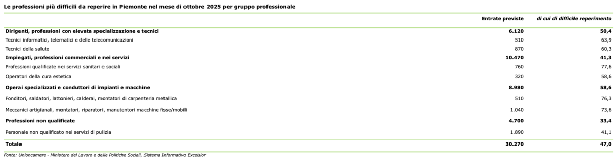 A ottobre 2025 sarà difficile da reperire sul mercato del lavoro il 47,0% delle figure professionali da inserire nelle aziende piemontesi, principalmente a causa della mancanza di candidati idonei a ricoprire le posizioni vacanti (31,8%), mentre nel 12,0% dei casi la ragione è da ricercare nell’inadeguata preparazione degli stessi. Il mismatch tra domanda e offerta di lavoro è in linea al dato medio nazionale (46,8%).