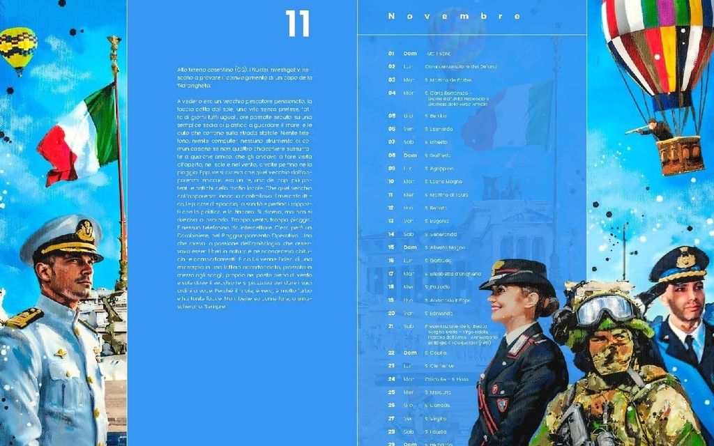 La prefazione, firmata da Aldo Cazzullo, offre uno sguardo storico e valoriale sull’arma, ricordando come i carabinieri, nati nel 1814, abbiano attraversato la storia d’Italia fino a oggi, protagonisti dei momenti fondativi della Nazione — dal Risorgimento alla Resistenza, fino alla modernità — rappresentando un simbolo di unità e sacrificio. Ed è a quei carabinieri, che hanno pagato con la propria vita, che rivolge un commosso pensiero e ringraziamento. La postfazione, affidata allo scrittore e giornalista Massimo Lugli, racconta un episodio vissuto in prima persona che diventa emblema della missione dei carabinieri: la prontezza, il coraggio e la naturalezza con cui, anche nei gesti più quotidiani, sanno donare sicurezza e conforto ai cittadini. La tavola del mese di novembre, attraverso la rappresentazione di un militare per ciascuna forza armata, è dedicata alla “difesa” e ai suoi valori. La scelta del mese coincide con la ricorrenza della “Giornata dell’unità nazionale e delle forze armate”, che celebriamo il 4 novembre, quest’anno suggellata dalla cerimonia nella città di Ancona.