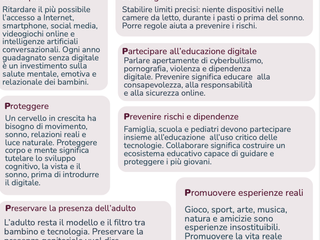 Le raccomandazioni SIP si rifanno ai principi guida della SIP: posticipare l’esposizione digitale, proteggere corpo e mente, promuovere esperienze reali e preservare la centralità dell’adulto. La tecnologia è uno strumento straordinario, ma deve entrare nella vita dei ragazzi al momento giusto, quando hanno la maturità per gestirla. Accompagnarli in questo percorso è una responsabilità condivisa tra famiglie, scuola e pediatri (vedere scheda le 7 P che aiutano a crescere).