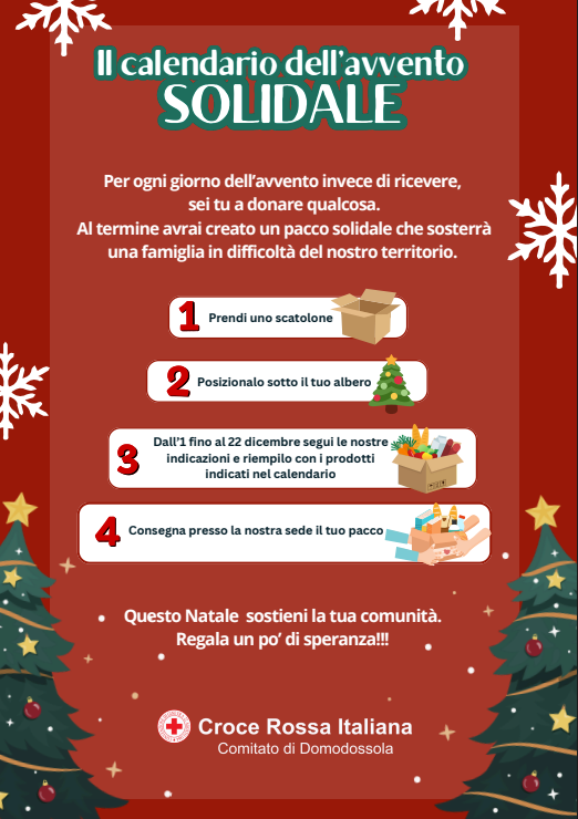 La Croce Rossa di Domodossola lancia una nuova iniziativa all’insegna della solidarietà e della condivisione: il calendario dell’avvento solidale, per compiere ogni giorno, fino a Natale, un piccolo gesto concreto a sostegno di chi vive un momento di difficoltà.