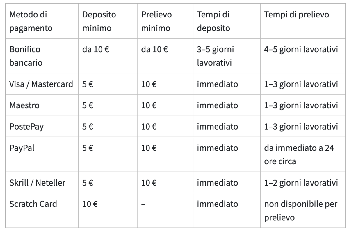 Qui sotto trovi una panoramica dei principali metodi disponibili per depositi e prelievi in euro: