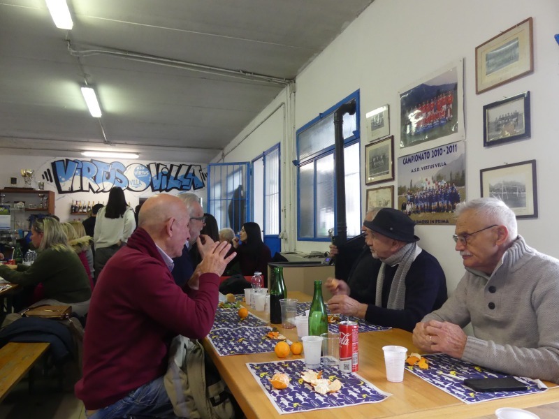 A seguire il pranzo, a base di polenta, salamini e gorgonzola, un menu semplice ma gustoso, molto apprezzato dai numerosi ospiti che hanno affollato l’ampio locale sottostante la tribuna e il tendone riscaldato piazzato per l’occasione a ridosso degli spalti. Erano più di 250 le persone presenti al campo, compresa tutta la attuale dirigenza virtussina, il responsabile del settore giovanile Paolo Riva, numerosi elementi della Prima Squadra e del settore giovanile, allenatori e accompagnatori.