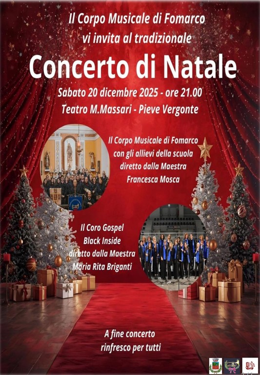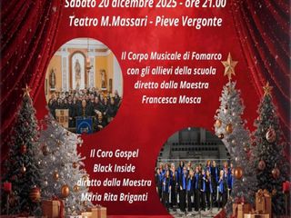 Il tradizionale Concerto di Natale del Corpo Musicale di Fomarco si terrà sabato 20 dicembre 2025 alle ore 21,00 presso il Teatro Massari di Pieve Vergonte. L’evento, guidato dalla maestra Francesca Mosca, sarà arricchito dall’esibizione del coro gospel Black Inside, diretto dalla maestra Maria Rita Briganti.