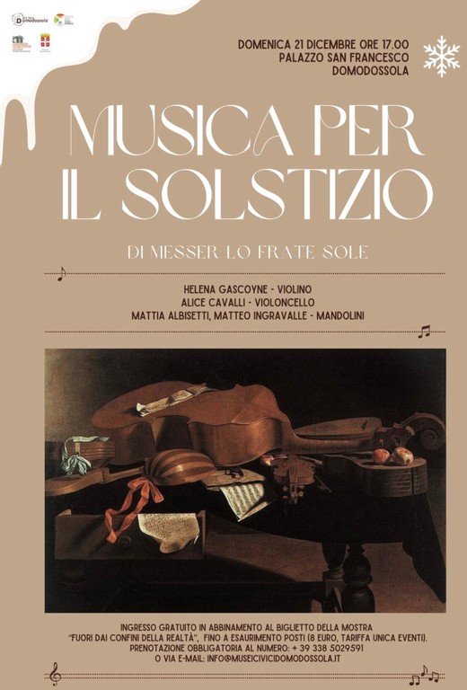 Dopo l’interessante incontro dedicato a Palazzo San Francesco, la rassegna prosegue con un nuovo appuntamento culturale all’insegna della musica. Domani, domenica 21 dicembre alle ore 17, nella Sala Mostre di Palazzo San Francesco a Domodossola, si terrà il concerto “Musica per il Solstizio di Messer lo Frate Sole”.