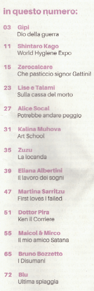 “La fine del mondo” è curata da Maicol & Mirco, nome d’arte di Michael Rocchetti (abbiamo parlato di questo artista in un articolo di qualche tempo fa), già collaboratore del quotidiano come vignettista. Attorno a lui si è costruito un parterre di autrici e autori che mette insieme alcune delle voci più riconoscibili del fumetto italiano e non solo. Nel primo numero compaiono, tra gli altri, Zerocalcare, Gipi, Bruno Bozzetto, Zuzu, Dr. Pira, Blu, Eliana Albertini, Martina Sarritzu, Kalina Muhova, Lise e Talami e Alice Socal. C’è anche una presenza internazionale di rilievo come Shintaro Kago, autore giapponese considerato uno dei riferimenti del manga horror.