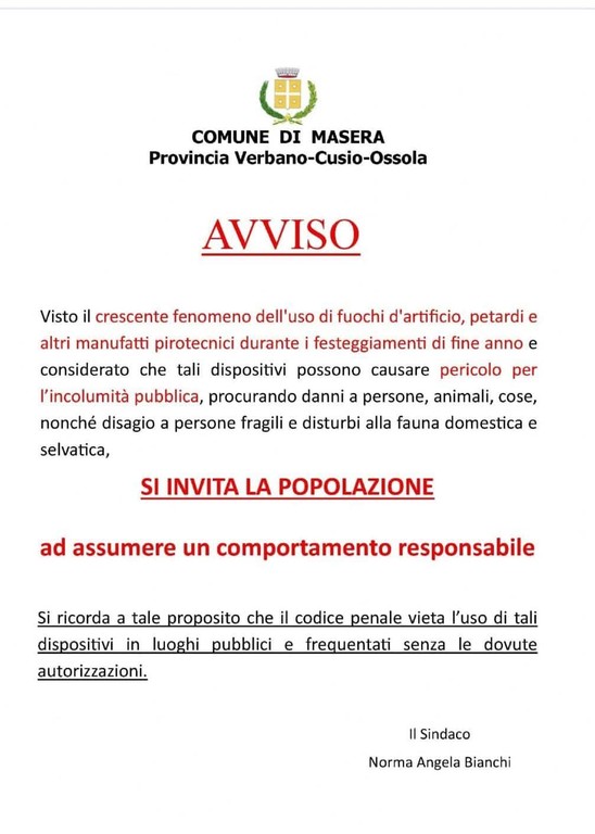 In vista dei festeggiamenti di fine anno, il Comune di Masera ha diffuso un avviso rivolto alla popolazione per chiedere un utilizzo responsabile dei giochi pirotecnici. Una comunicazione che nasce dal “crescente fenomeno dell’uso di fuochi d’artificio, petardi e altri manufatti pirotecnici durante i festeggiamenti di fine anno”, come riportato nella nota firmata dal sindaco Norma Angela Bianchi.
