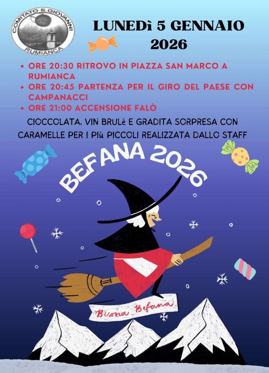 Durante il falò non mancherà l’arrivo della Befana, che distribuirà ricche calze e dolci a tutti i bambini presenti. La manifestazione si concluderà in convivialità con una bicchierata a base di vin brulé e cioccolata calda, offerti dal Comitato San Giovanni Rumianca.