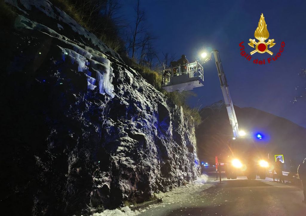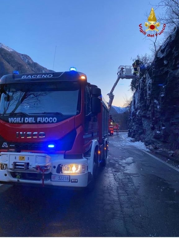 I vigili del fuoco volontari del distaccamento di Baceno con il supporto della piattaforma aerea proveniente dalla sede centrale del Comando del Verbano-Cusio-Ossola sono intervenuti nel pomeriggio di oggi per la messa in sicurezza della strada statale 659 della valle Antigorio. Nel tratto tra Crodo e Baceno, a monte della strada, su degli affioramenti rocciosi, alcuni lastroni di ghiaccio formatisi in queste settimane a causa delle temperature, si sono staccati con il rischio di collassare e cadere sulla statale. Lunghe le operazioni che hanno impegnato i vigili del fuoco fino alle 18, quando ormai era sopraggiunto il buio. La strada è rimasta chiusa a tratti per consentire le operazioni di messa in sicurezza.