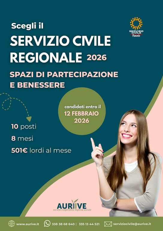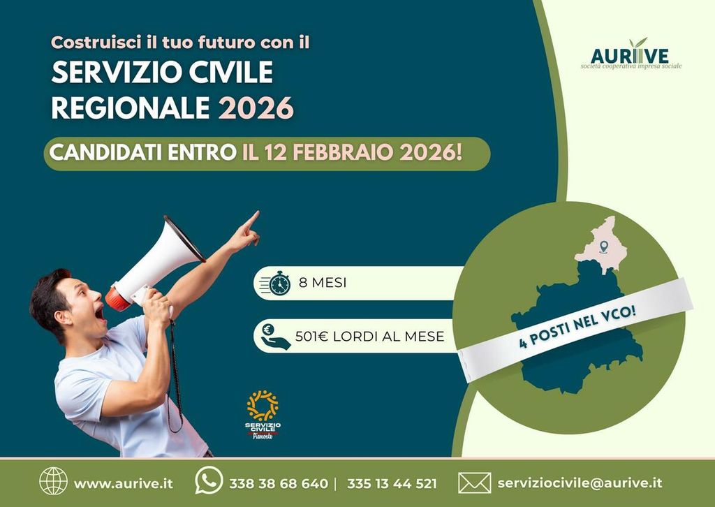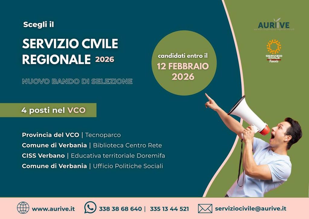 È partito oggi, lunedì 19 gennaio, il nuovo bando del Servizio Civile Regionale Volontario, che mette a disposizione nel Verbano Cusio Ossola quattro posti per giovani tra i 18 e i 28 anni. Il progetto, coordinato dalla cooperativa Aurive in collaborazione con enti pubblici e privati del territorio, si intitola “Spazi di partecipazione e benessere: giovani attivi per stili di vita sani e senza dipendenze” e punta a promuovere stili di vita sani, animazione territoriale e inclusione sociale.