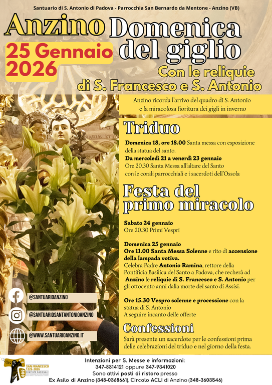 Nel 2026 le celebrazioni assumono un valore ancora più significativo, legandosi all’importante anniversario degli ottocento anni dalla morte di San Francesco. Per l’occasione, fra Antonio Ramina, rettore della Pontificia Basilica di Sant’Antonio di Padova, porterà ad Anzino alcune reliquie insigni di San Francesco e di Sant’Antonio. Un evento eccezionale per il piccolo paese della Valle Anzasca, reso possibile grazie al rapporto di collaborazione che da oltre quarant’anni lega il santuario ossolano a Padova e all’Ordine dei Frati Minori Conventuali.