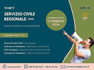 È partito oggi, lunedì 19 gennaio, il nuovo bando del Servizio Civile Regionale Volontario, che mette a disposizione nel Verbano Cusio Ossola quattro posti per giovani tra i 18 e i 28 anni. Il progetto, coordinato dalla cooperativa Aurive in collaborazione con enti pubblici e privati del territorio, si intitola “Spazi di partecipazione e benessere: giovani attivi per stili di vita sani e senza dipendenze” e punta a promuovere stili di vita sani, animazione territoriale e inclusione sociale.