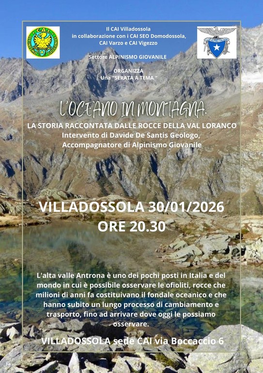Nuovo anno e primo appuntamento di ritrovo venerdì 30 gennaio alle ore 20.30 presso la sede CAI di Villadossola, con una serata a tema geologia. “L’oceano in montagna” sarà l’argomento sviluppato grazie al geologo Davide De Santis, accompagnatore di alpinismo giovanile, abituato a stare con bambini e ragazzi.
