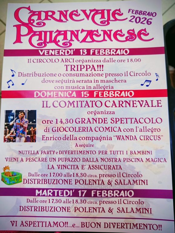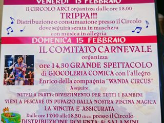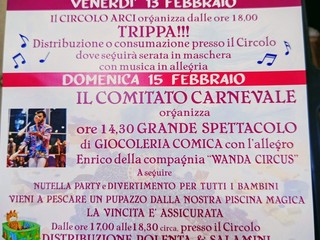 L’apertura ufficiale è in programma venerdì 13 febbraio al Circolo Arci, con la distribuzione della trippa a partire dalle ore 18. La serata proseguirà con una festa in maschera accompagnata da musica, dando il via a una settimana di eventi nel pieno spirito carnevalesco.