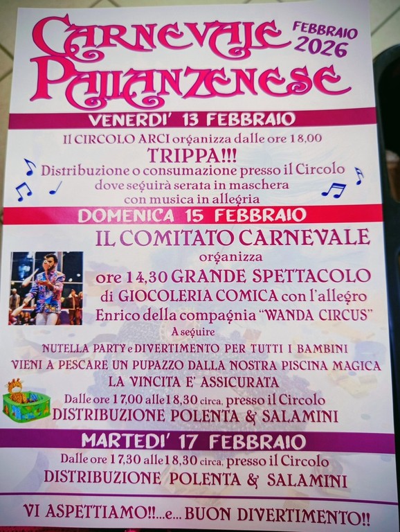 Il momento clou sarà domenica 15 febbraio, organizzata dal Comitato Carnevale. Alle 14.30 andrà in scena il grande spettacolo di giocoleria comica con Enrico della compagnia “Wanda Circus”, pensato in particolare per i bambini e le famiglie. Nel corso del pomeriggio spazio anche al Nutella Party, ai giochi e alla tradizionale pesca del pupazzo, con premi garantiti per tutti i partecipanti. Dalle 17 alle 18.30, presso il Circolo, sarà inoltre possibile gustare polenta e salamini.