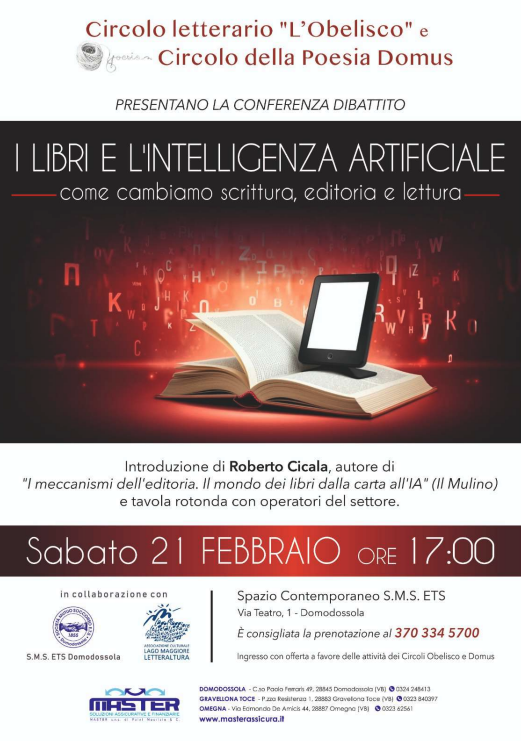 Un pomeriggio di riflessione sul futuro della scrittura, dell’editoria e della lettura nell’era dell’intelligenza artificiale. Sabato 21 febbraio, alle ore 17.00, allo Spazio Contemporaneo della Società di Mutuo Soccorso Domodossola in via Teatro 1, a Domodossola, si terrà la conferenza-dibattito dal titolo “I libri e l’intelligenza artificiale – come cambiano scrittura, editoria e lettura”.