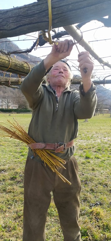 Lega infatti la vigna con i salici, un'antica pratica rurale eco sostenibile che utilizza rami flessibili di salice per ancorare i tralci ai supporti. I salici che ha piantato vicino ad una lanca li raccoglie alcuni giorni prima di legare la vigna nel periodo di luna calante e li conserva in cantina. I vigneti che coltiva sono storici hanno oltre cento anni sono a pergola, nota come topia, con colonne in pietra spesse e pesanti come sostegno verticale e pali di legno orizzontali.