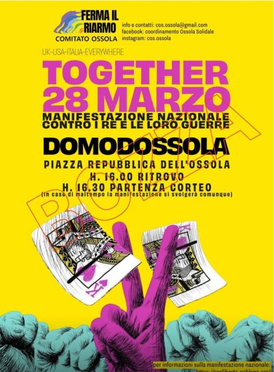 Anche a Domodossola è in programma per sabato 28 marzo la manifestazione nazionale intitolata “Together”, un’iniziativa promossa dal Comitato Ossola “Ferma il Riarmo” contro il riarmo e i conflitti armati.