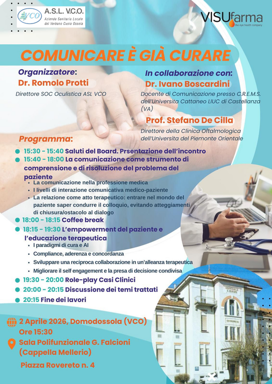 L’iniziativa è promossa dall’Asl VCO con il supporto di VISUfarma, e si propone di approfondire il ruolo della comunicazione nella pratica clinica contemporanea.